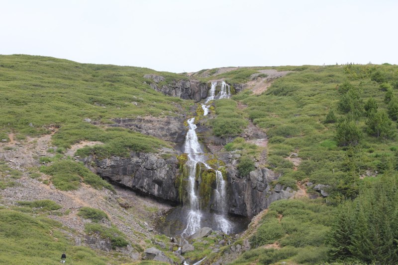 After we left the church, we drove all the way across the area again to a waterfall/camping area. The tour-guide explained that the area has the ‘summer houses’ of the residents of Isafjordur, and that the locals like to go there and camp as well. We saw many people camping. Not only were they camping in the area near the waterfall, but they were also camping right in town too, in vacant lots across from businesses and homes, it was strange to see campsites right in town. She also explained that recently, they had an avalanche and most of the summer homes were destroyed and a man was killed. Now they have made it illegal for anyone to be in those homes in the winter, and they have put in place some avalanche-preventing berms.