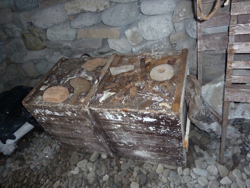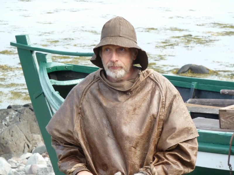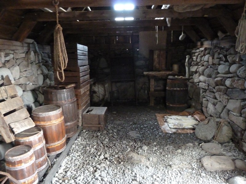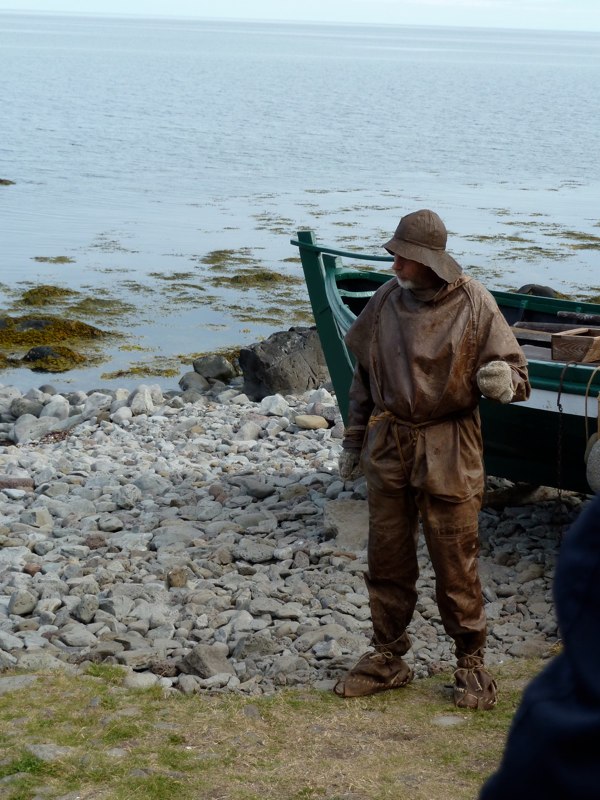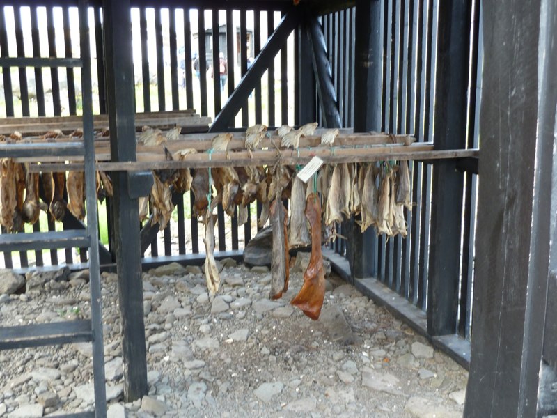 We started our day out early with a tour of the ‘Best of Isafjordur.’ Our first stop was a fishing camp. They explained that this camp and camps like it were in use in the area from about the year 900 through the early 1900’s. They had the camp set up like it was during those times. A gentleman was dressed up in authentic fishing gear, made from sheep’s skin that had been treated with fish oil to give it a waterproof characteristic. He spoke in Icelandic while our tour-guide translated. They also had the buildings set up they way they lived. There were usually two ship crews to a camp, a crew consisting of 6 men. There was always a woman at camp too, and she would cook, clean and basically manage the housekeeping/maintenance of the camp/buildings, while the men concentrated on fishing and processing the catch.