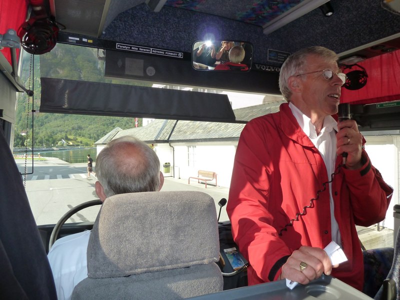 The port visit was a short one today. We arrived around 7:30 am, and left at 2pm. We had a tour scheduled to visit the Voringfossen Waterfall, but we didn’t need to meet for that tour until 9:15 so we hopped off the ship early to poke around the town of Eidfjord for a while. It was early, and nothing was open yet, but it was nice to walk around in the cool morning mist and view the lovely town near the harbor. Soon it was time to get back on the ship and meet with our fellow passengers and go on tour. We gathered in the Cabaret lounge and headed off the ship again to our awaiting tour bus. Our tour guide was a nice fellow who struggled a bit with his English, but did a nice job. He pointed out some landmarks along our route and he explained a little about the economy, and the tunnels we went through, and the road taxes, and such. Sounds really boring, but it was interesting.