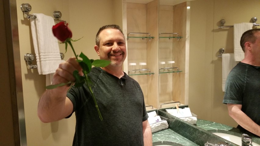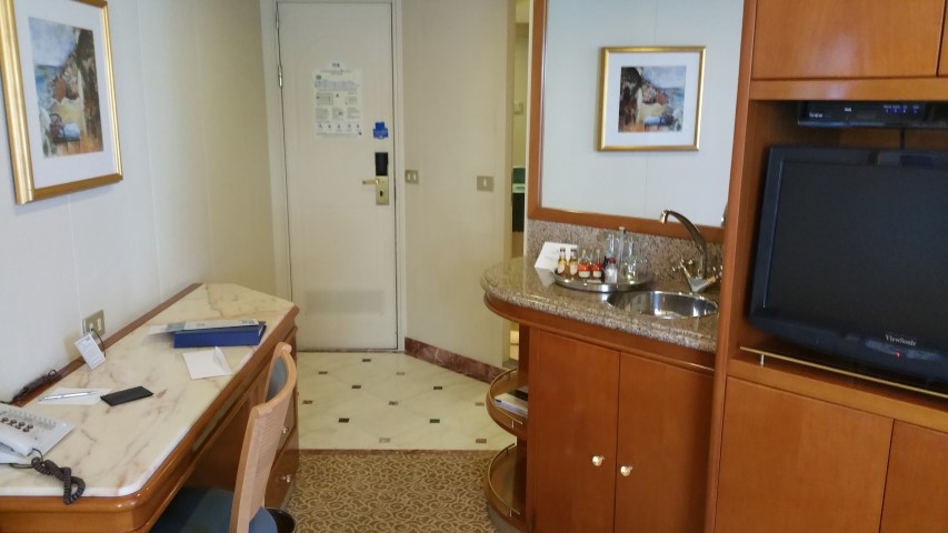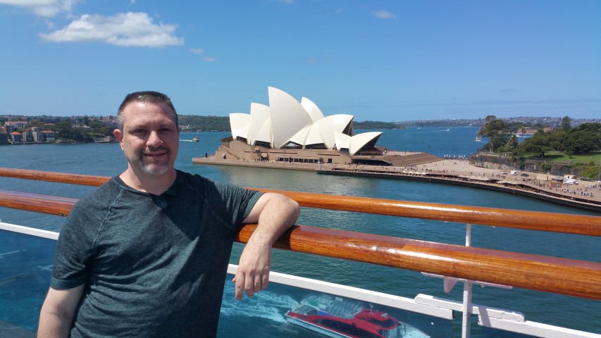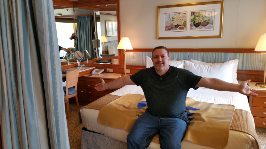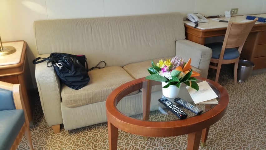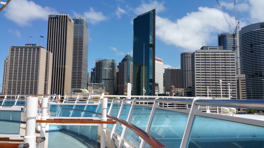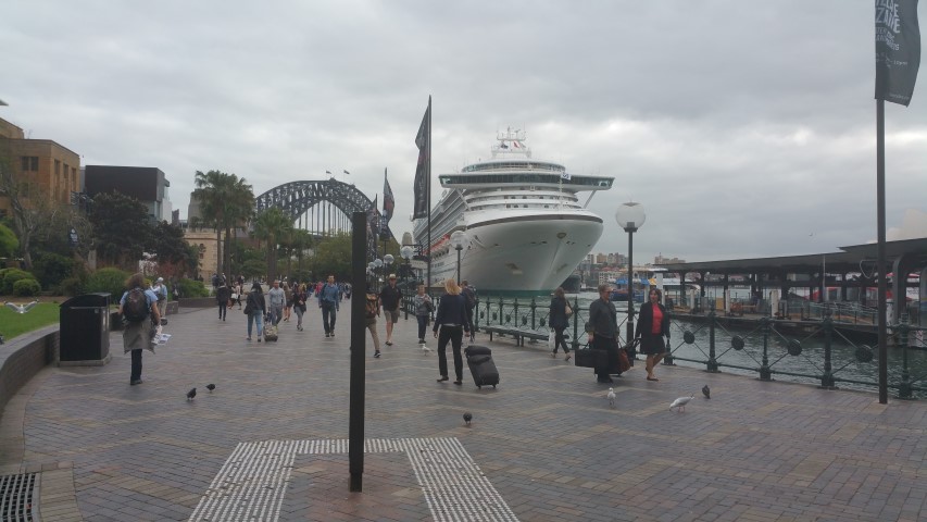 Today our cruise begins. We couldn’t get over how great it was to literally walk across the street to our port! We got up, had a leisurely breakfast at Starbucks, did a little people watching, and then it was time to check out of our hotel and walk over to the ship. Because we are Platinum members, we were able to board early and explore the ship until our room was ready. We were in the Caribe Suite – which was an amazing room. We had a lovely view of the Harbor Bridge and the Opera House from our balcony too. Our suite was at the very back of the ship!