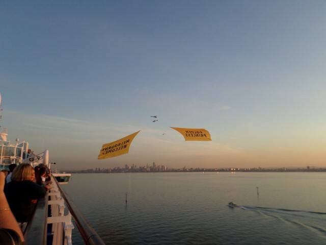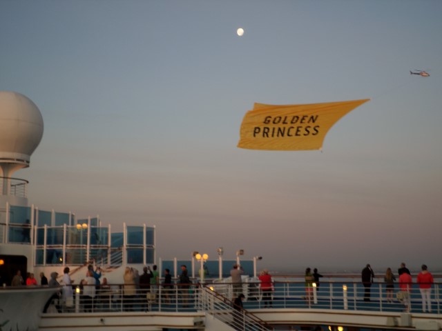 We awoke to the sound of helicopters buzzing around the ship. We ran up to the deck and were treated to the sight of these big golden banners being dragged behind the helicopters. As the sun rose in the morning sky, we could see hot-air balloons floating over the city too. It was pretty spectacular!