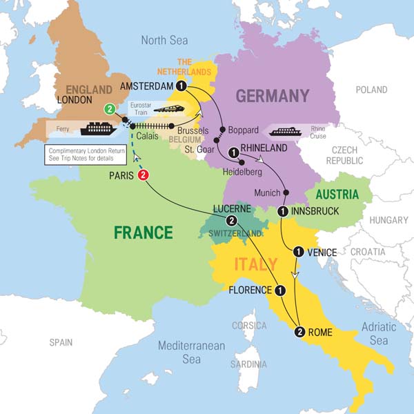 Travel along the Ruhr and Rhine valleys. Enjoy picturesque scenery all the way to Boppard, where an included cruise takes you past vine-clad hills and crumbling medieval castles to St. Goar. Later enjoy views of the red sandstone castle towering above Heidelberg.