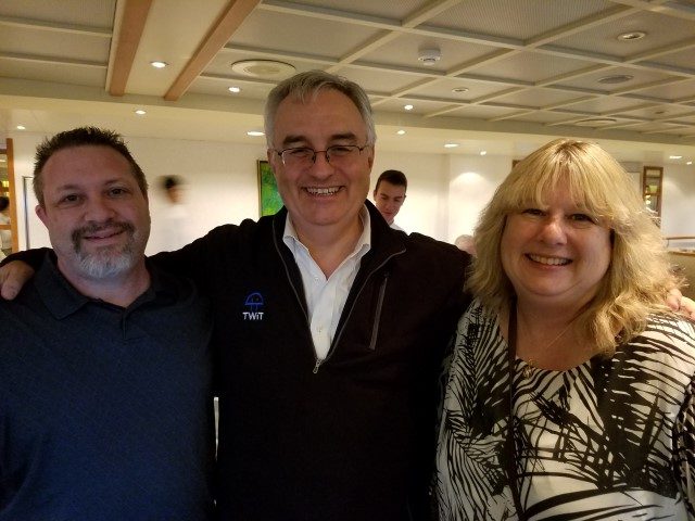 Tonight at dinner we had an extra special treat. We met Leo Laporte (KFI’s “The Tech Guy” that we listen to each weekend) and his lovely wife, Lisa. I had called into Leo’s show to ask him for suggestions for software to use for offline blogging (because internet connectivity is usually spotty at sea) and mentioned that we were going on this cruise – Leo and I compared notes on dates, and found out we’d be on the cruise together! He invited us to come say ‘hello’ while on board, and we had not really had a good opportunity to do so until this evening. We had a short but great visit with him and his wife, and she was so kind, and snapped a photo of us with Leo. What a fun visit!
