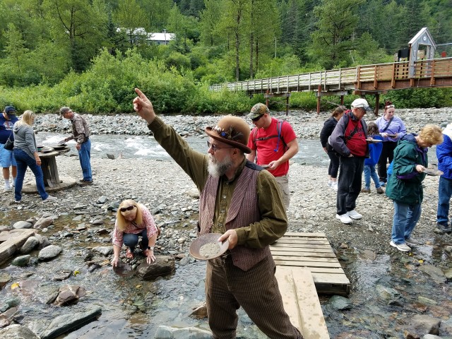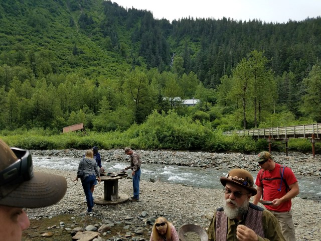 Today we went panning for gold! We thought it would be fun to follow in the footsteps of some of the earliest gold-rush settlers of Alaska, so we went on an excursion that took us panning for gold, and then to an old fashioned salmon bake! Our weather was wonderful again, and we had a terrific time!