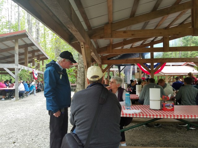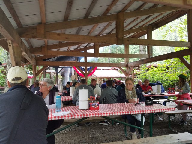After we left the suspension bridge, it was time to go to our salmon bake in Liarsville. On the way, we saw a bear! When she first came into view, she had two little cubs with her, but none of us got our cameras out quick enough to photograph them…they were hiding in the bushes behind mom.