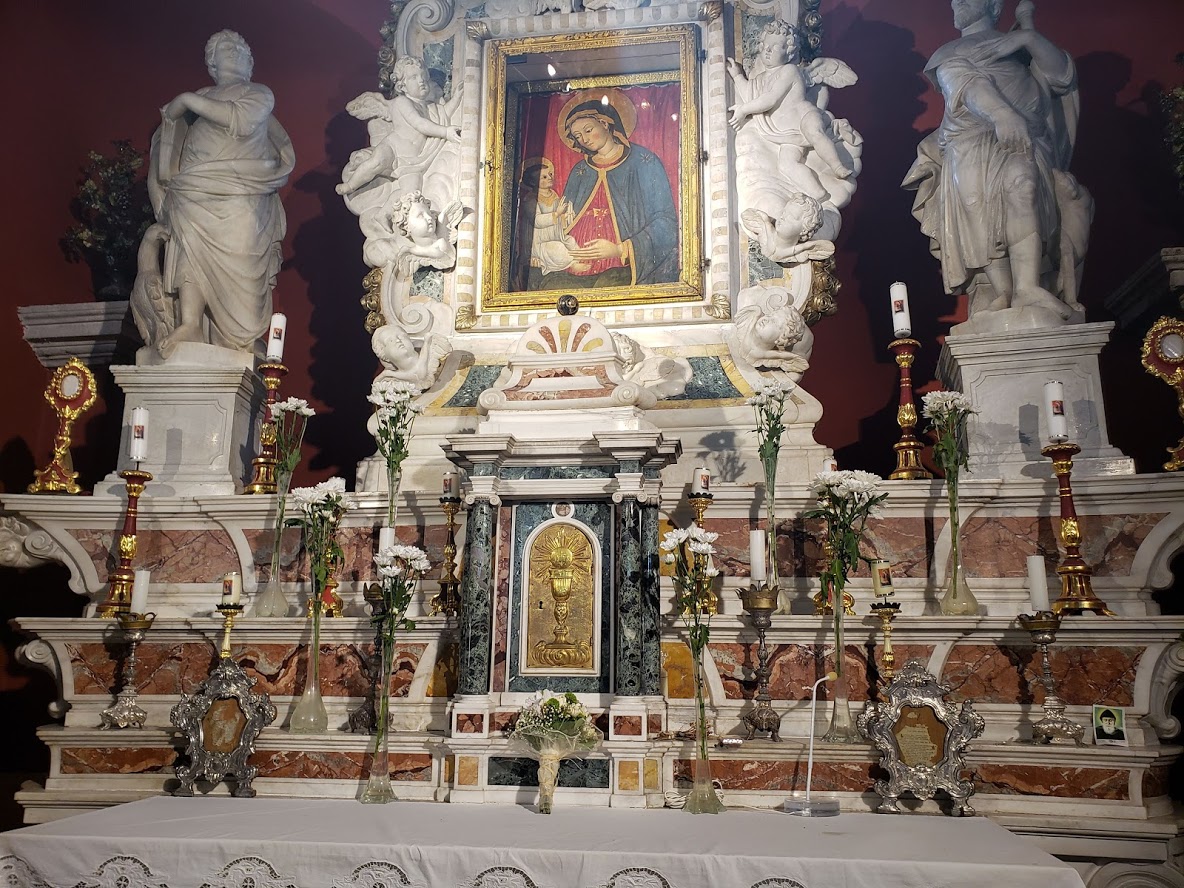 The Roman Catholic Church of Our Lady of the Rocks (Italian: Chiesa della Madonna dello Scarpello) is the largest building on the islet; it has a museum attached. There is also a small gift shop close to the church and a navigation light at the western end of the islet.