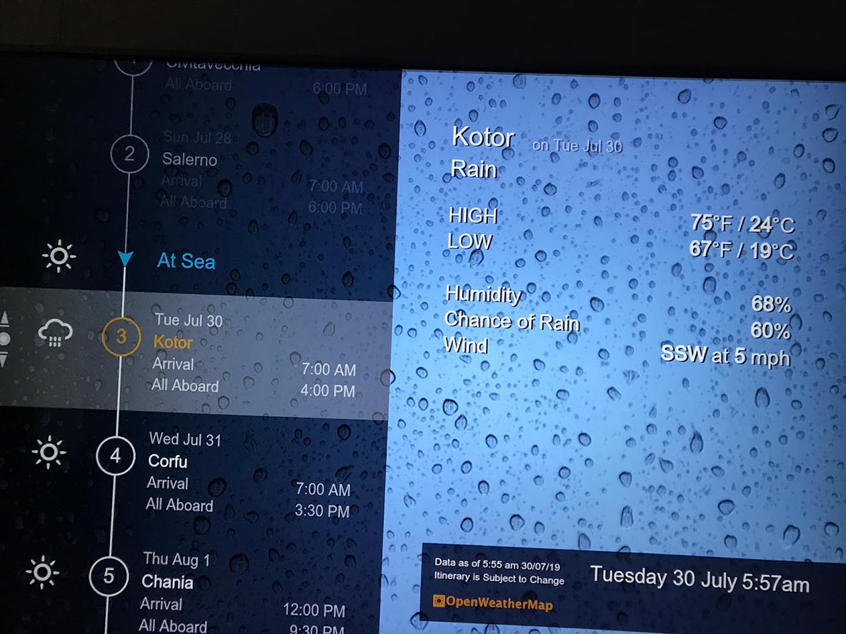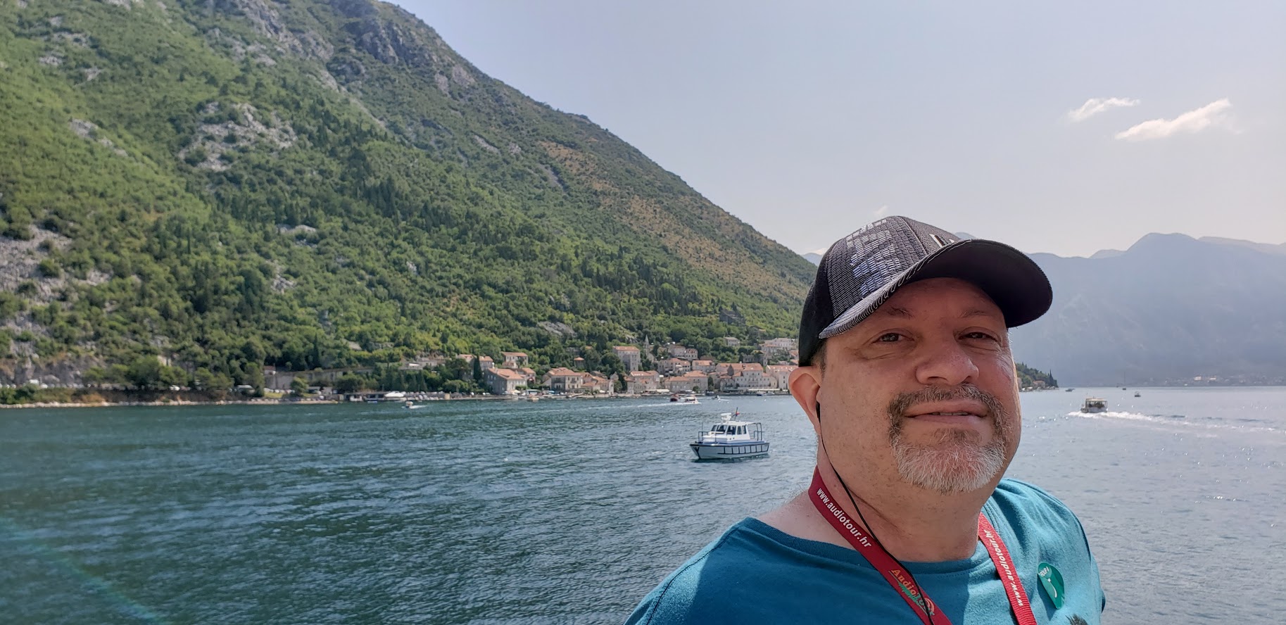 Day 7 – July 30th – Kotor, Montenegro. Our tour today was a walking tour of the “Old City,” and then a bus ride to nearby Perast– to take a boat to the “Lady of the Rock” church on a little man-made island in the middle of the channel.