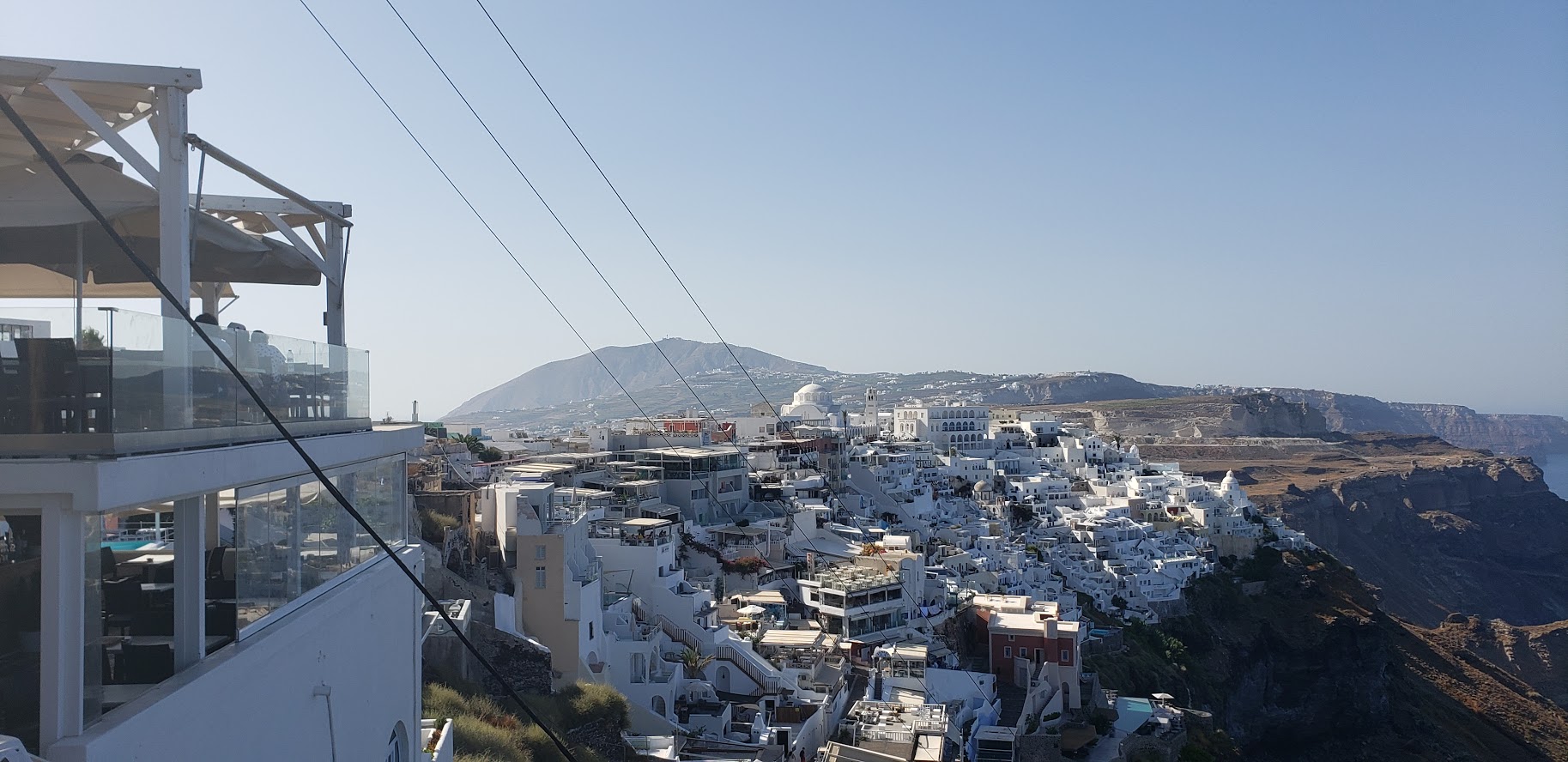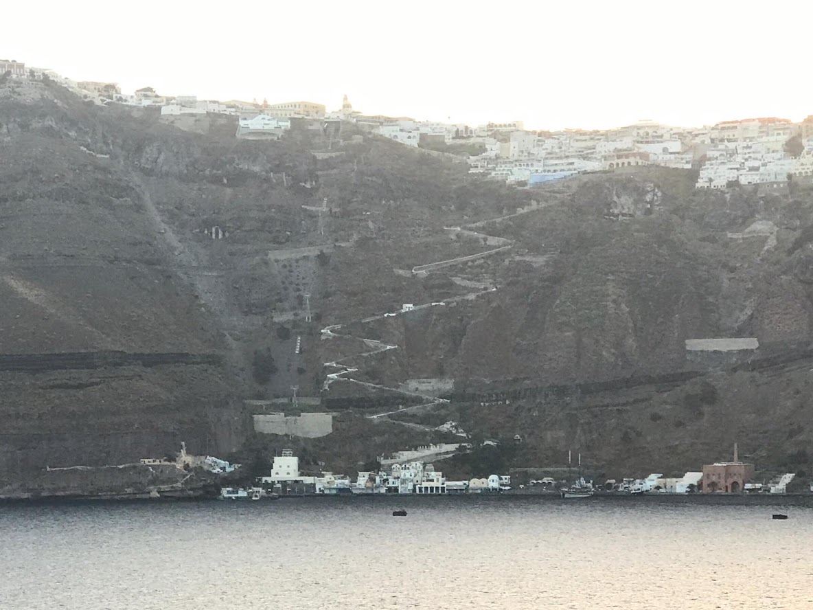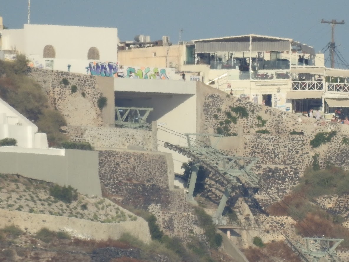 The harbor was at the foot of Fira up a very long climb so we took the cable car up in lieu of walking up the huge path (or taking donkeys).