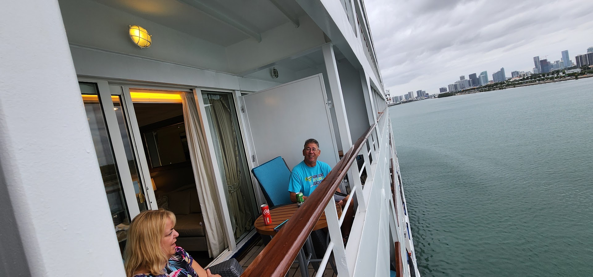 We unpacked and sat on our balcony to watch the sail-away. David and Cindy did the same and we figured out how to open the door between the balconies to make one big one (sshhh! Don’t tell Regent.. they said not to do it). We had a lot of fun but sail away got delayed for some reason so we didn’t leave until around 6:30. The views out of the port were amazing as the colors of all the buildings were really popping. It was also very nice weather – perhaps a little windy and colder than expected but still very nice.