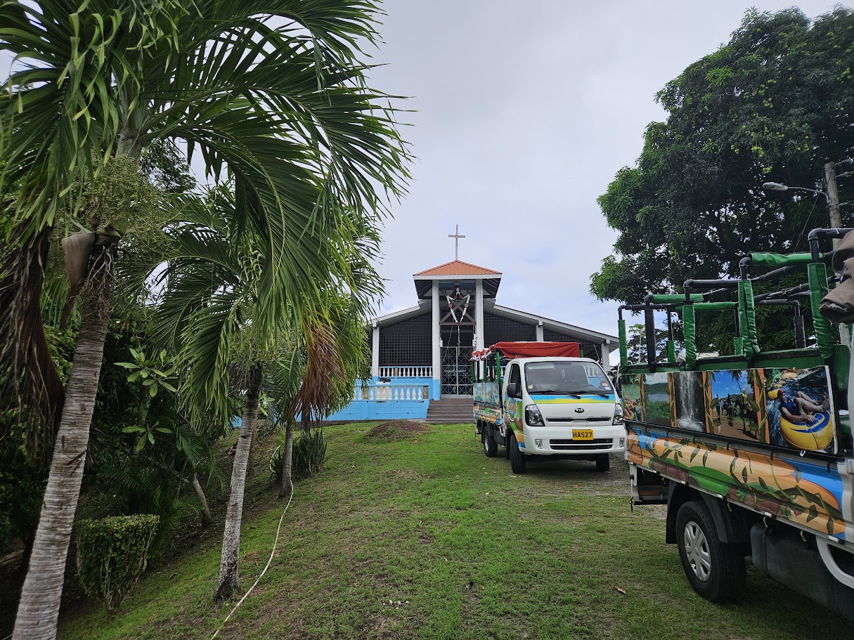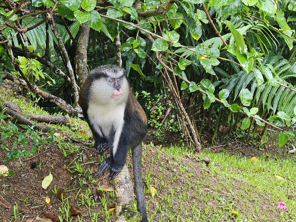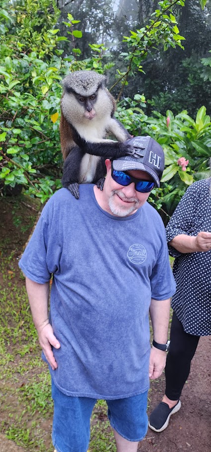 We had some photo stops along the way as we drove all around the island. We stopped for a quick snack and at a local church (which was closed) and then we went to a little shack where this man was who helped you get one of the 100+ monkeys in the area on your shoulder for a photo! We did it and it was lots of fun and the monkey was very cool! Then we drove back to the ship for trivia and dinner! Tonight there was a singer and he was entertaining.