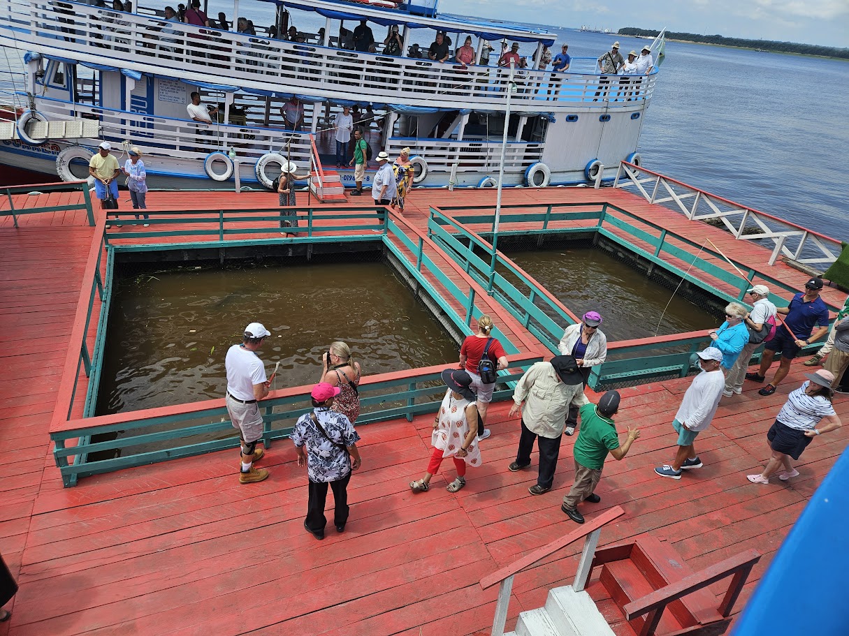 Today our tour was another “Meeting of the Waters” cruise. This was also supposed to include a visit to a lake where we would see giant water lilies, however the water levels are too low for the lake, so instead we were taken to a fishing village/landing. They had giant fish (The arapaima, also known as the pirarucu or paiche, is a giant fish that lives in the Amazon River basin. It’s the world’s largest freshwater fish, weighing up to 440 pounds!) in large tanks that we could feed with raw fish tied to ropes on poles – it was kind of fun to feed them. There were also tables set up with lots of local arts and crafts and we got a wall hanging for our ‘travel wall’ by Adam’s desk. One of these days we need to get a curio cabinet for our travel treasures! We also received a beautiful paper-weight/globe from Regent Cruises as a thank you gift for spending our holiday with them. We also got a nice present from Bella’s trainers – four beautiful holiday photos of our Bella girl! The entertainment tonight was a repeat performance from Colleen Williams with some holiday music. Susan skipped it but Adam, Dave and Cindy went and enjoyed it.