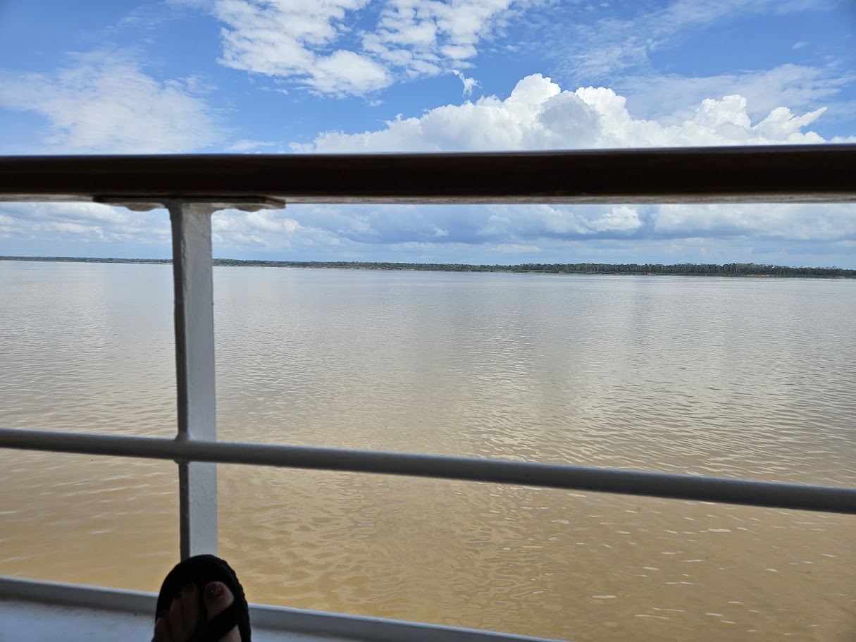 We took some photos and looked at some of the gift stands that were around but nothing really looked interesting. It was very very hot so Susan and Cindy sat in the shade while Adam and David explored a bit more but there wasn’t a whole lot of interesting things to see here. It was very very hot so we decided to go back to the ship. After dinner at the Compass Rose we watched “Top Gun Maverick”. We’d all seen it before but it was fun to see it again on the big screen. Tomorrow is our last port in the Amazon 🙁