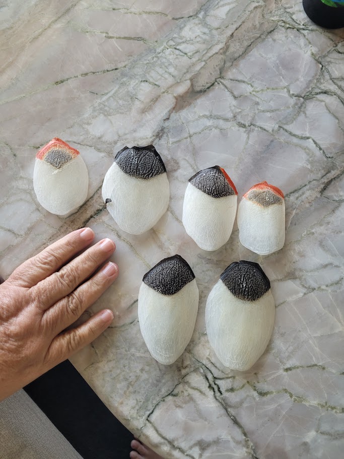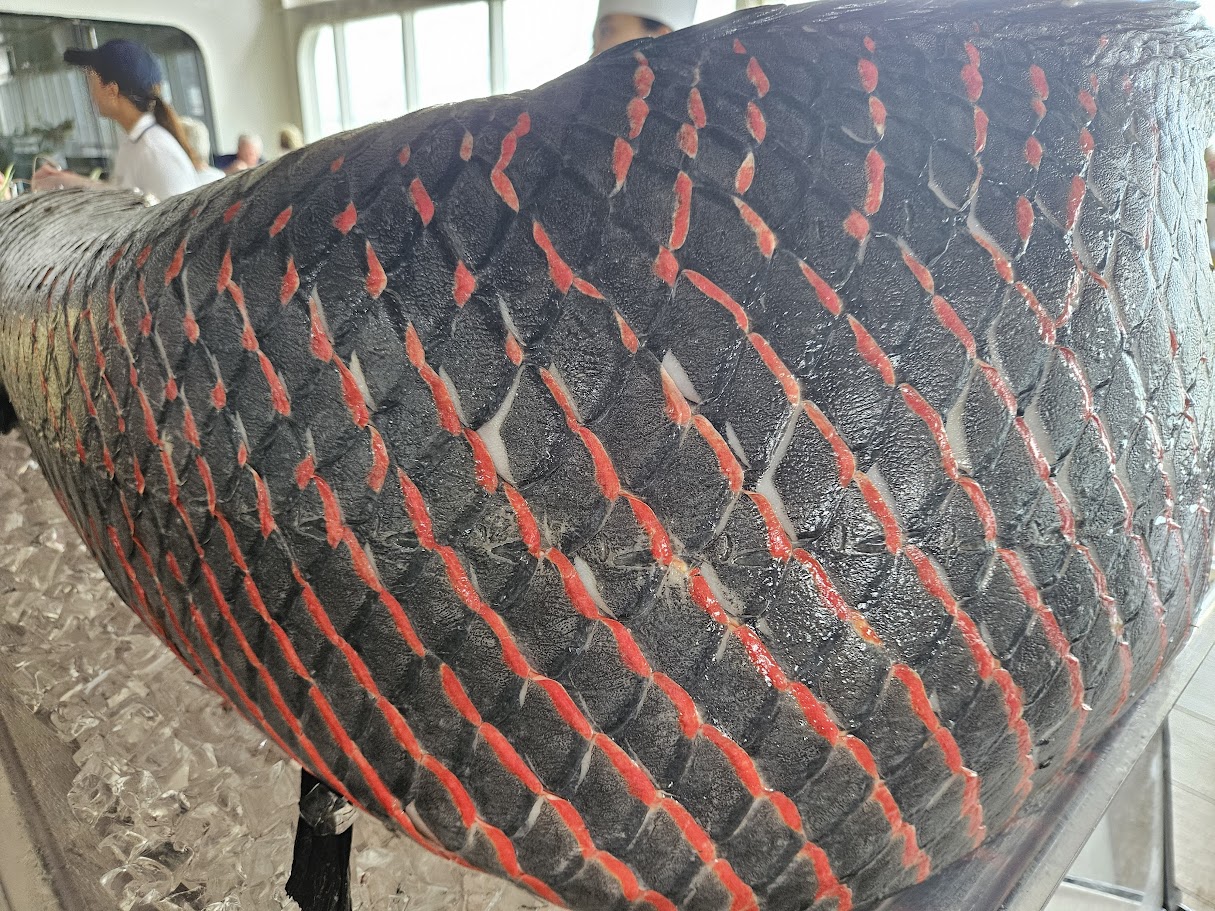 Next they had one of those arapaima fish in the pool-side grill for lunch! They had only carved half of it and had the rest on display so folks could see how huge they were and see the large scales. They even had some of the scales set out to take if you wanted some – I took a couple for Kevin and David and Cindy took a couple. I don’t think any of us actually tried the fish but a lot of folks where ordering it!